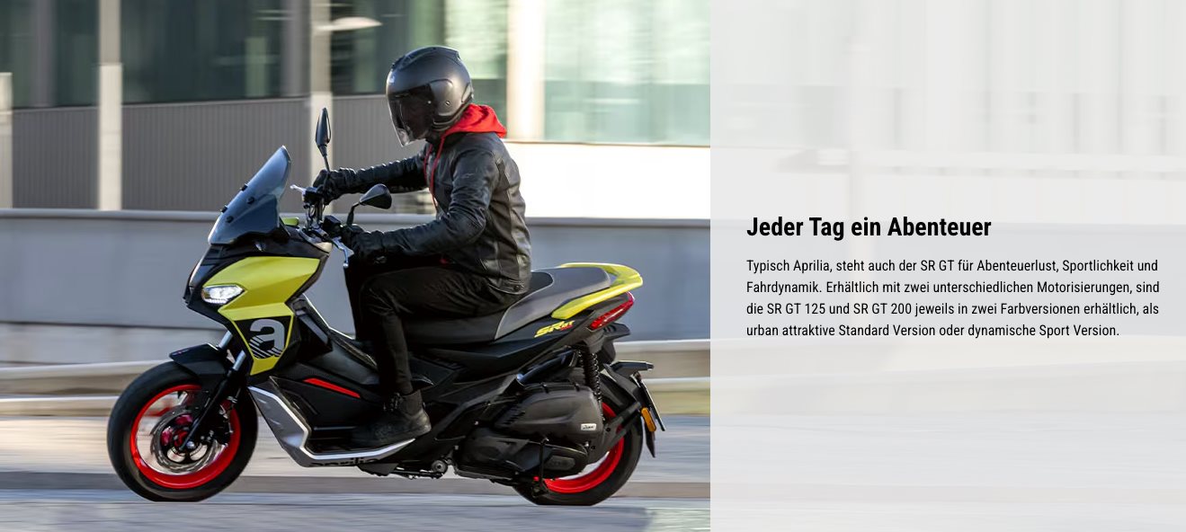 *Von den Aktionsvorteilen können ausschließlich Personen profitieren, die bei einem teilnehmenden PIAGGIO Group Vertragshändler im Aktionszeitraum vom 01. November 2025 bis 30. November 2025 einen schriftlichen Kaufvertrag über einen neuen SR GT 125 Euro 5+, SR GT 125 Sport Euro 5+, SR GT 125 Replica Euro 5+, SR GT 200 Sport Euro 5+, SR GT 200 Replica Euro 5+ oder SR GT 200 Euro 5+. Im Aktionszeitraum steht nur eine begrenzte Anzahl von Aktionsfahrzeugen zur Verfügung. Die Aktion gilt solange der Vorrat reicht, und die PIAGGIO Group behält sich die Beendigung der Aktion auch vor dem 30. November 2025 vor. Beim Kauf eines SR GT 125 Euro 5+, SR GT 125 Sport Euro 5+, SR GT 125 Replica Euro 5+, SR GT 200 Sport Euro 5+, SR GT 200 Replica Euro 5+ oder SR GT 200 Euro 5+ können Kunden von Aktionsvorteilen in Höhe von bis zu 1.000,00 Euro profitieren. Den verbindlichen Endpreis der einzelnen Modelle, einschließlich anfallender Nebenkosten, teilt der teilnehmende PIAGGIO Group Vertragshändler mit. Eine Barauszahlung der Aktionsvorteile ist nicht möglich. Sollte der Kunde vom Kaufvertrag zurücktreten, so verfällt auch der Anspruch auf die Aktionsvorteile bzw. diese sind zurückzuerstatten. Die Aktionsvorteile sind nicht mit anderen Aktionen und auch nicht untereinander kombinierbar und werden von der PIAGGIO Group und vom teilnehmenden PIAGGIO Group Vertragshändler getragen.
